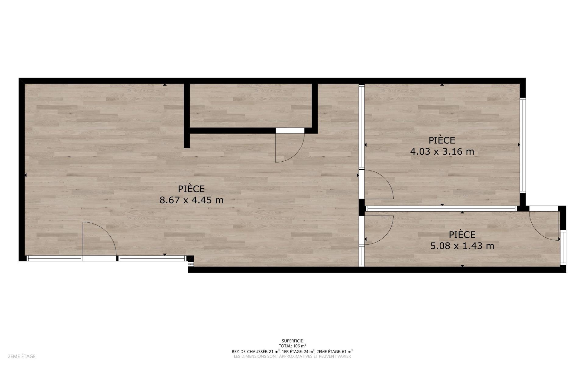 Aménagement : Une première partie de 40 m², deux bureaux séparés de 8 m² et 12 m² ainsi qu'un WC.