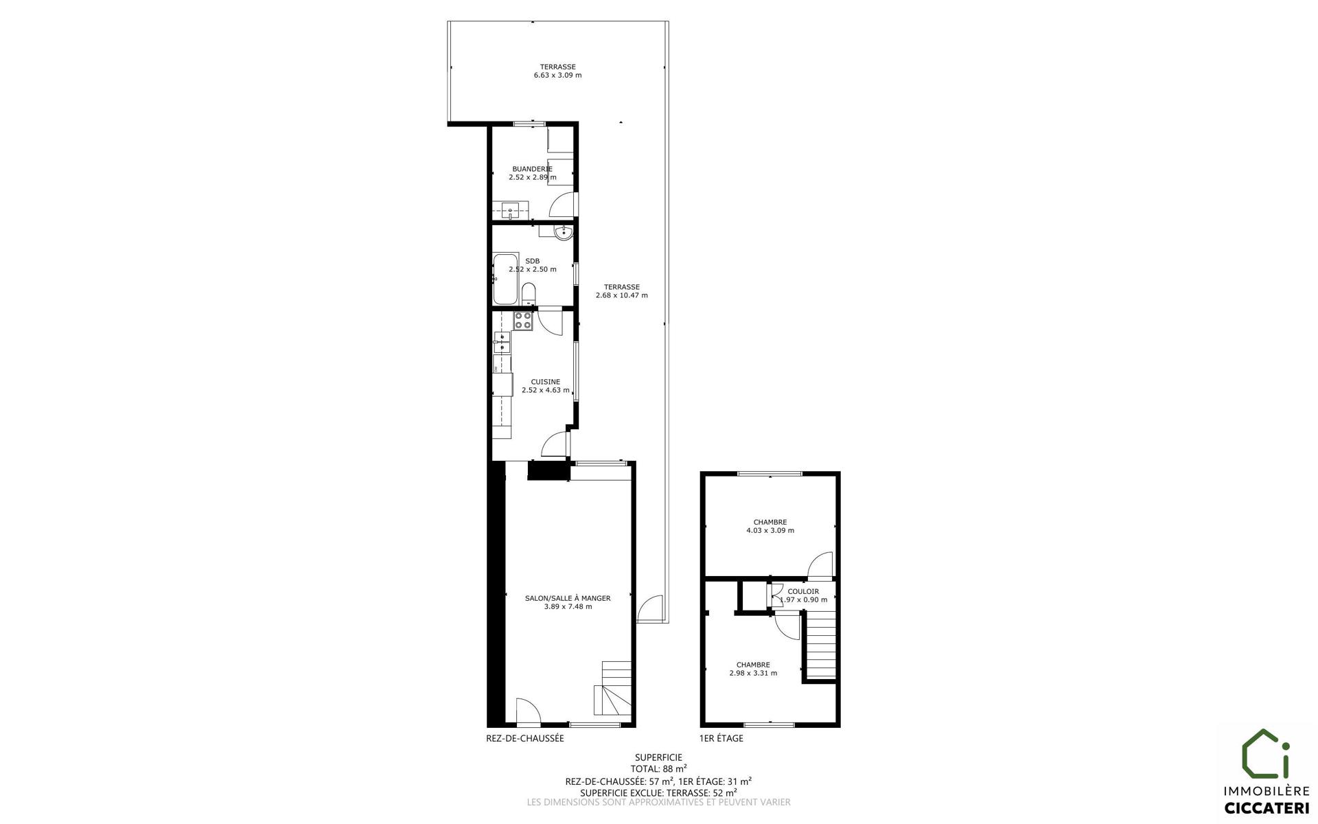 Au rez-de-chaussée : un séjour spacieux de 30 m², une cuisine meublée, une salle de bain et une buanderie.
