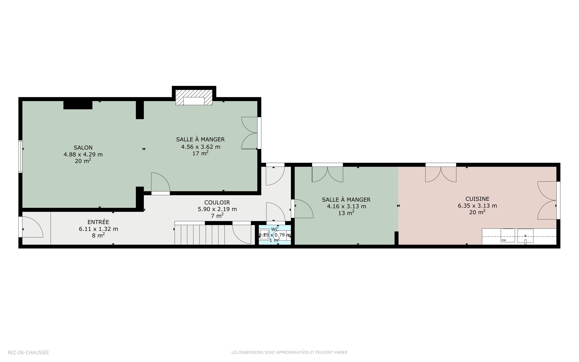 Elle se compose d’un hall d'entrée menant à un séjour lumineux de 37 m² ainsi qu’à une grande cuisine équipée avec espace salle à manger de 33 m², chauffée par un poêle à pellets. Grâce à ses baies vitrées, la cuisine bénéficie d’une superbe luminosité.