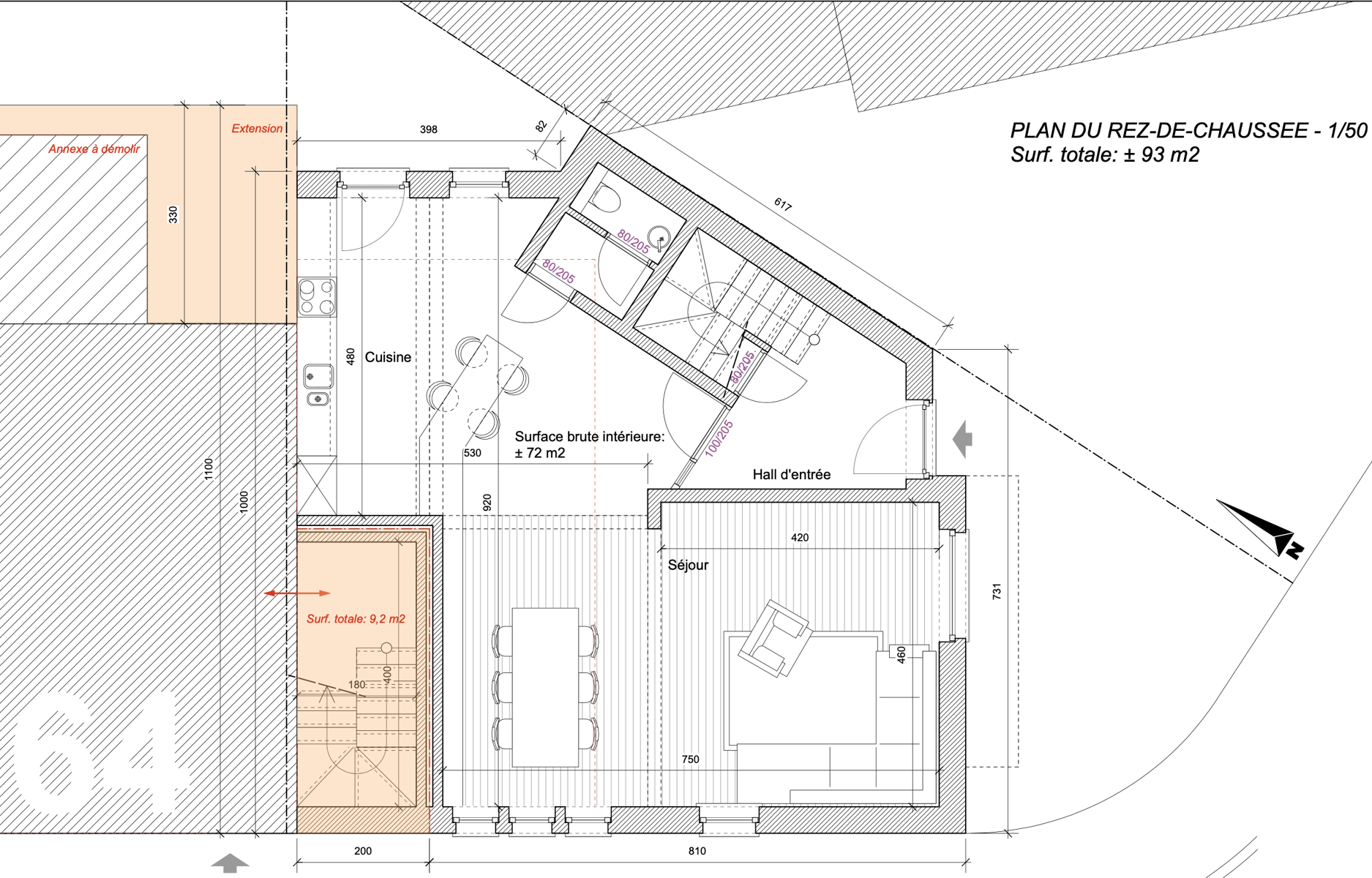 La maison actuelle se compose d’un salon, d’une salle à manger, d’une cuisine, de trois chambres, d’un garage et d’une cave. Elle nécessite une rénovation complète : remplacement des châssis, remise aux normes de l’installation électrique, nouvelle installation de chauffage, raccordement au gaz, et réaménagement intérieur.